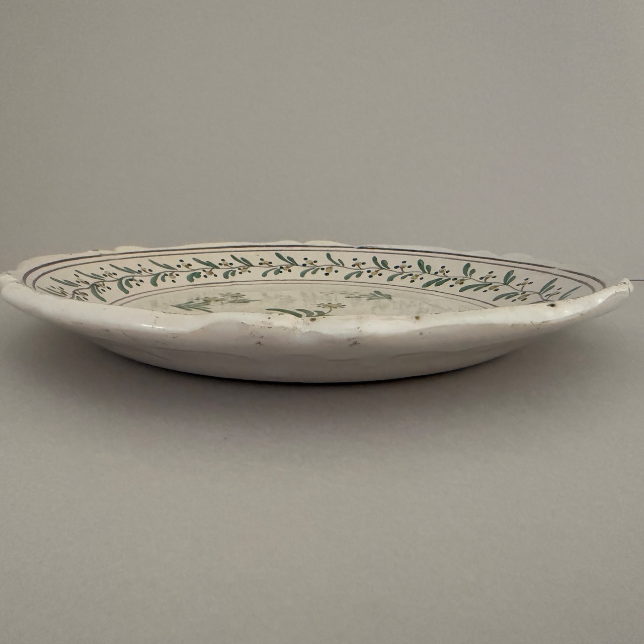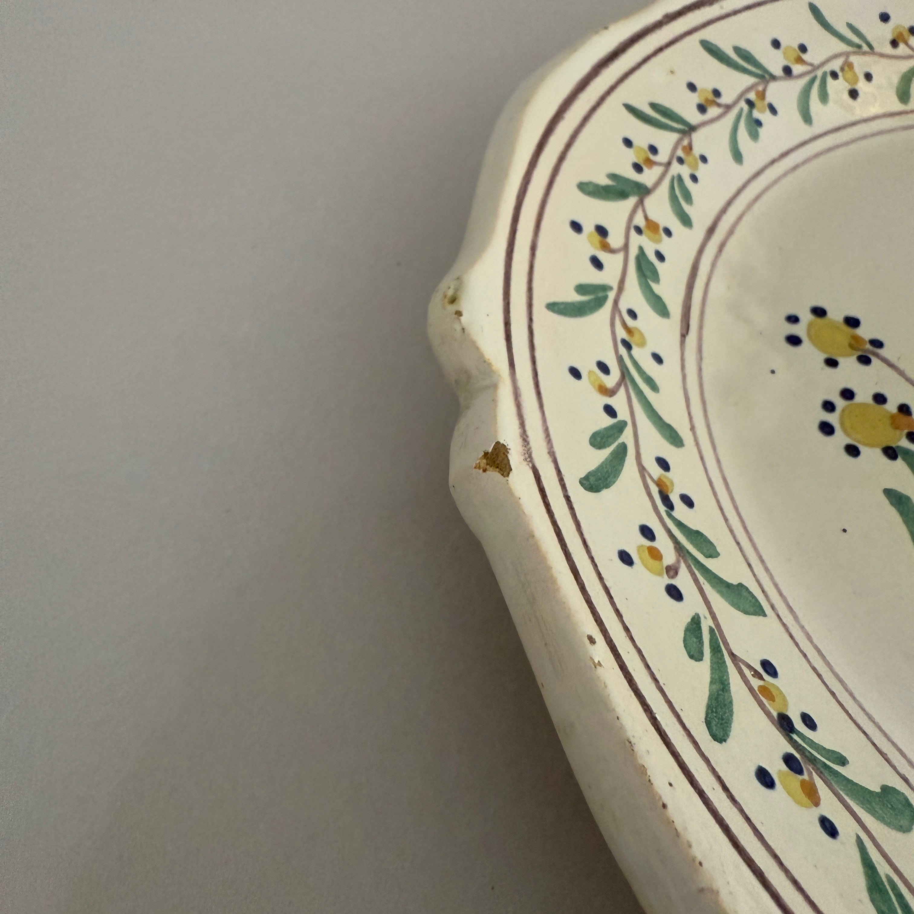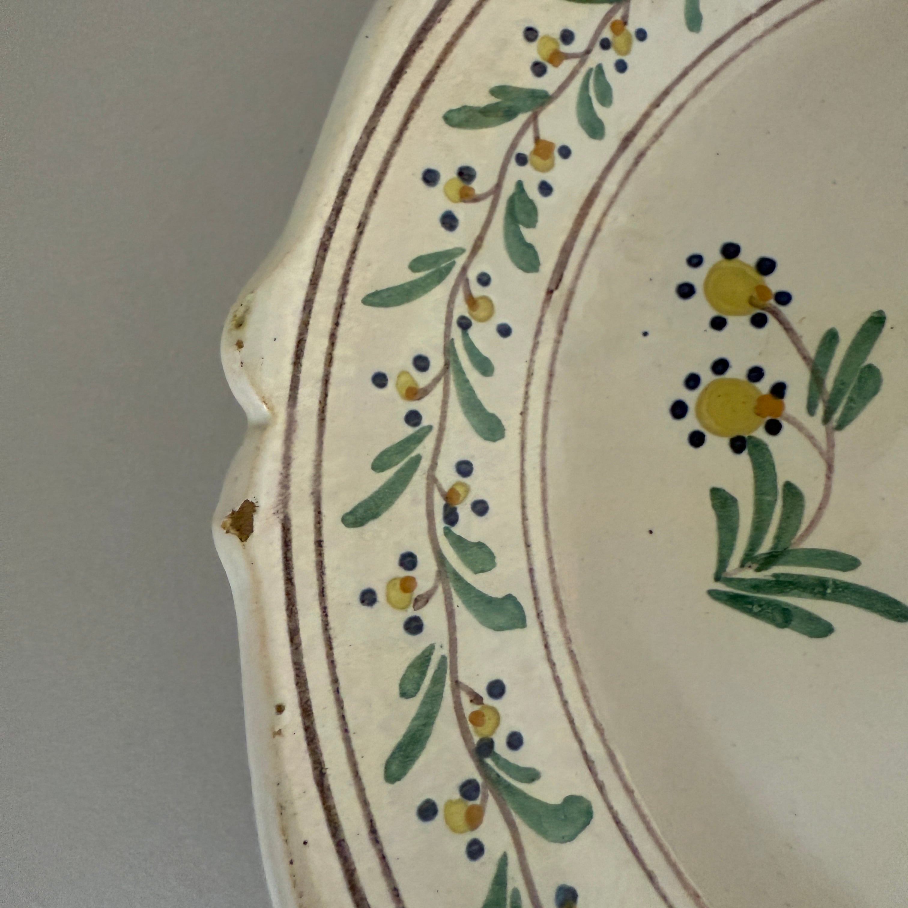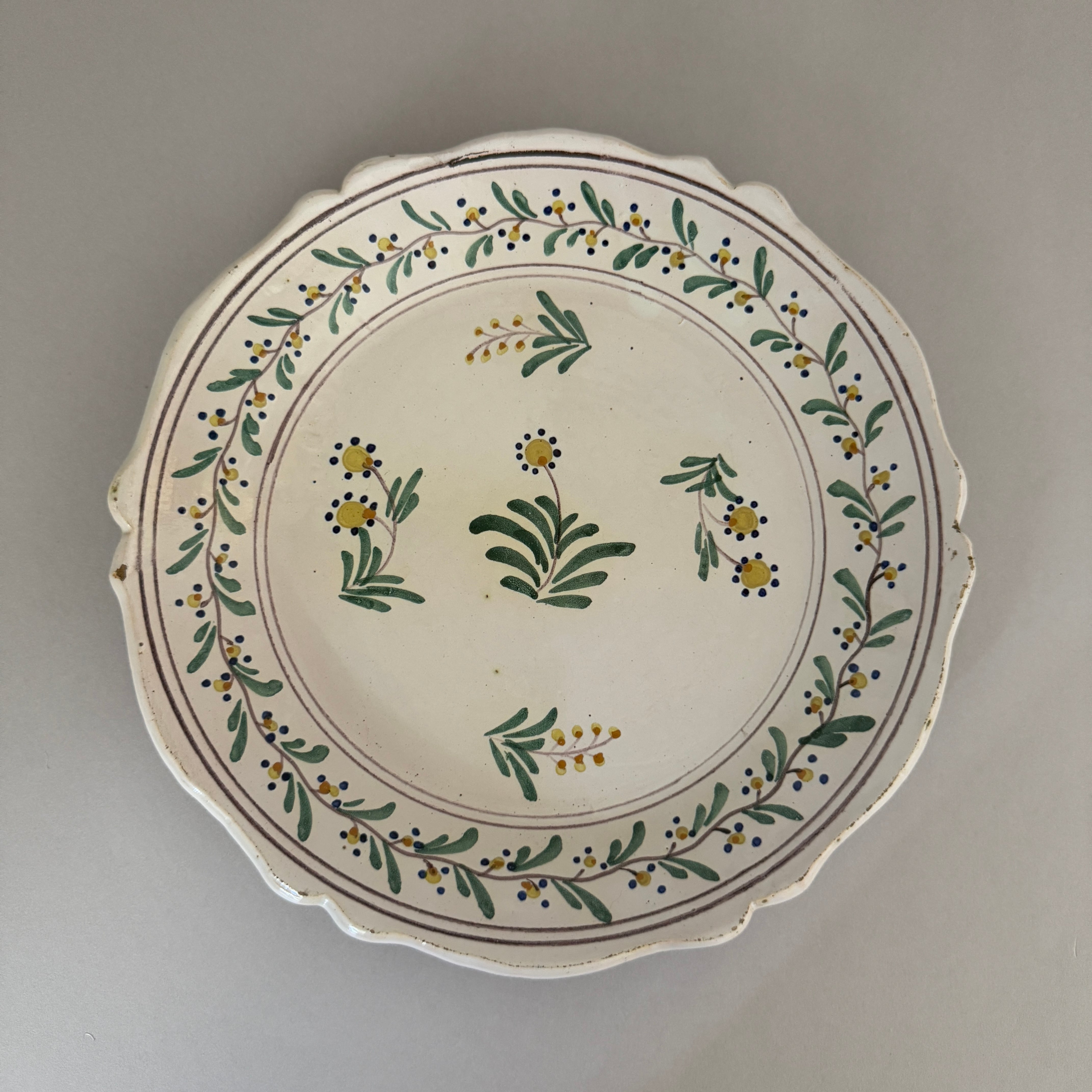 The softly shaped rim, reminiscent of rose petals, gives the plate the gentle and rounded character typical of traditional faience.