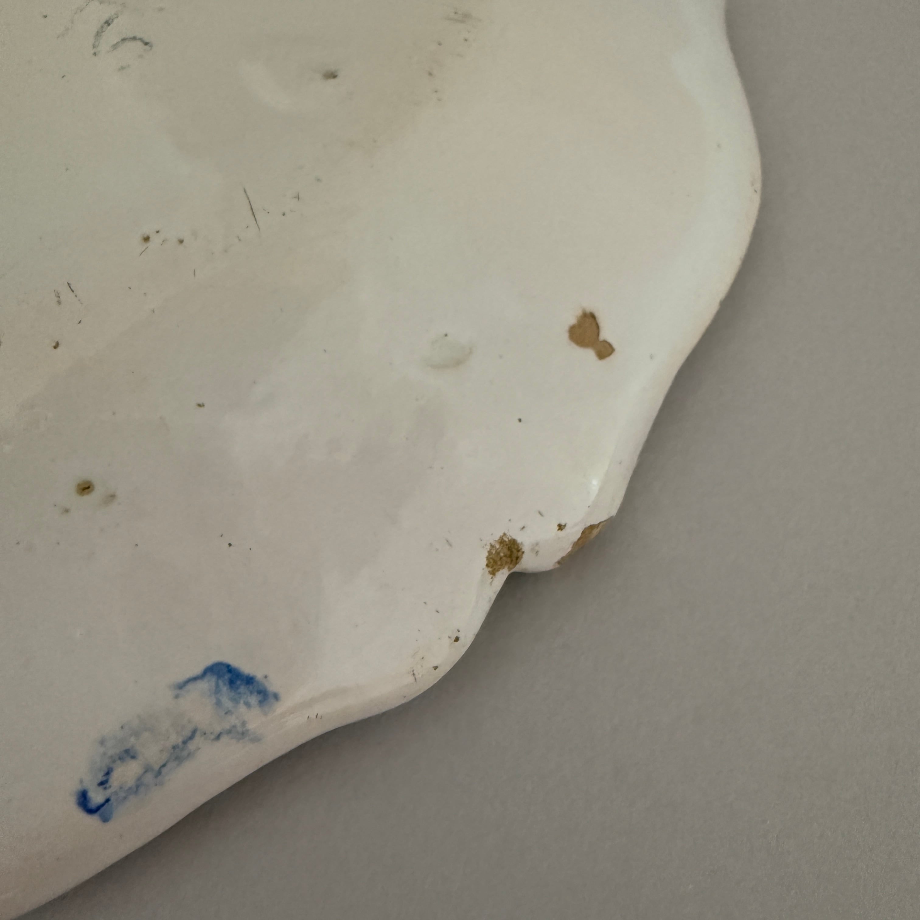 The combination of tin glaze, hand-painted decoration, and the elegant rim design highlights the craftsmanship of the period.