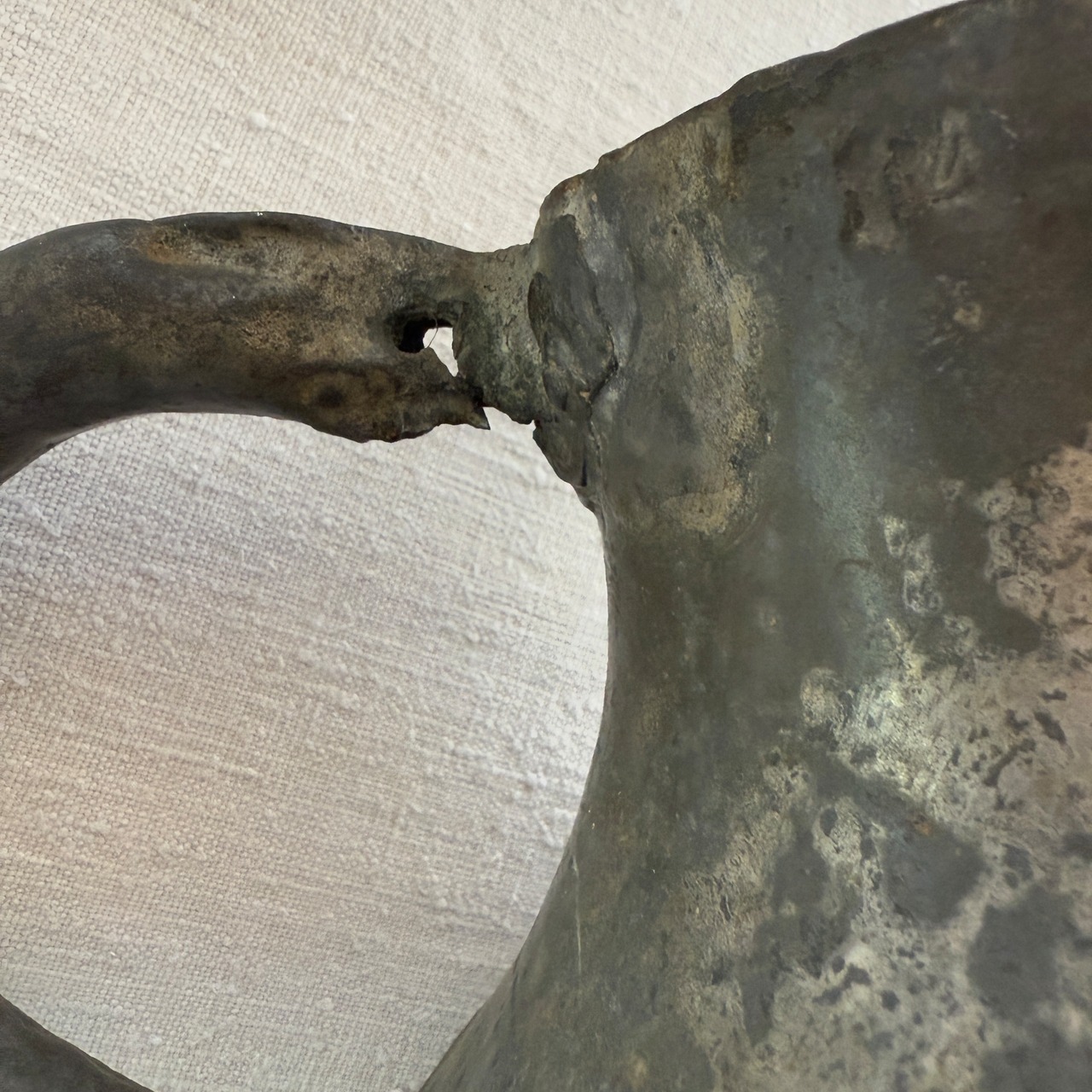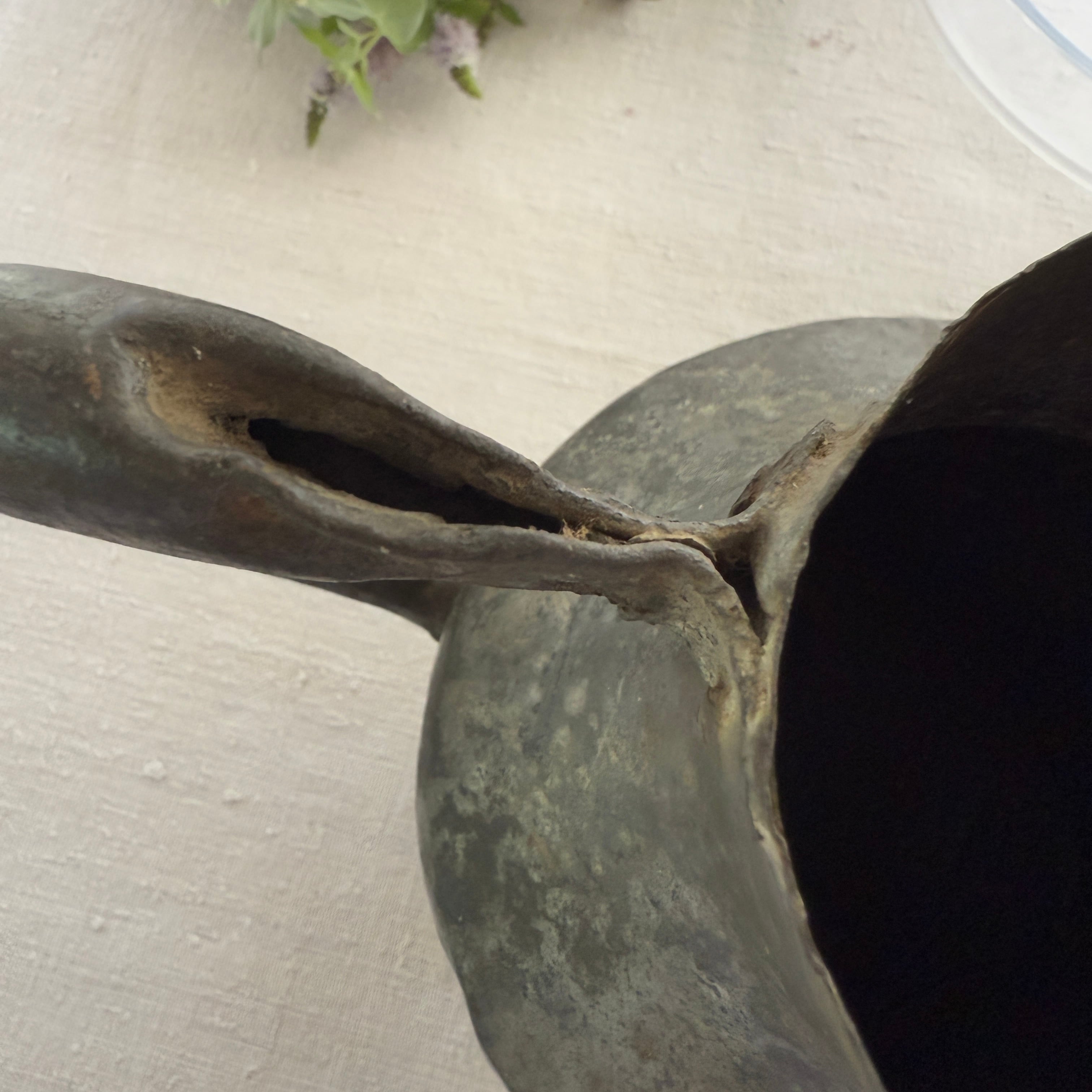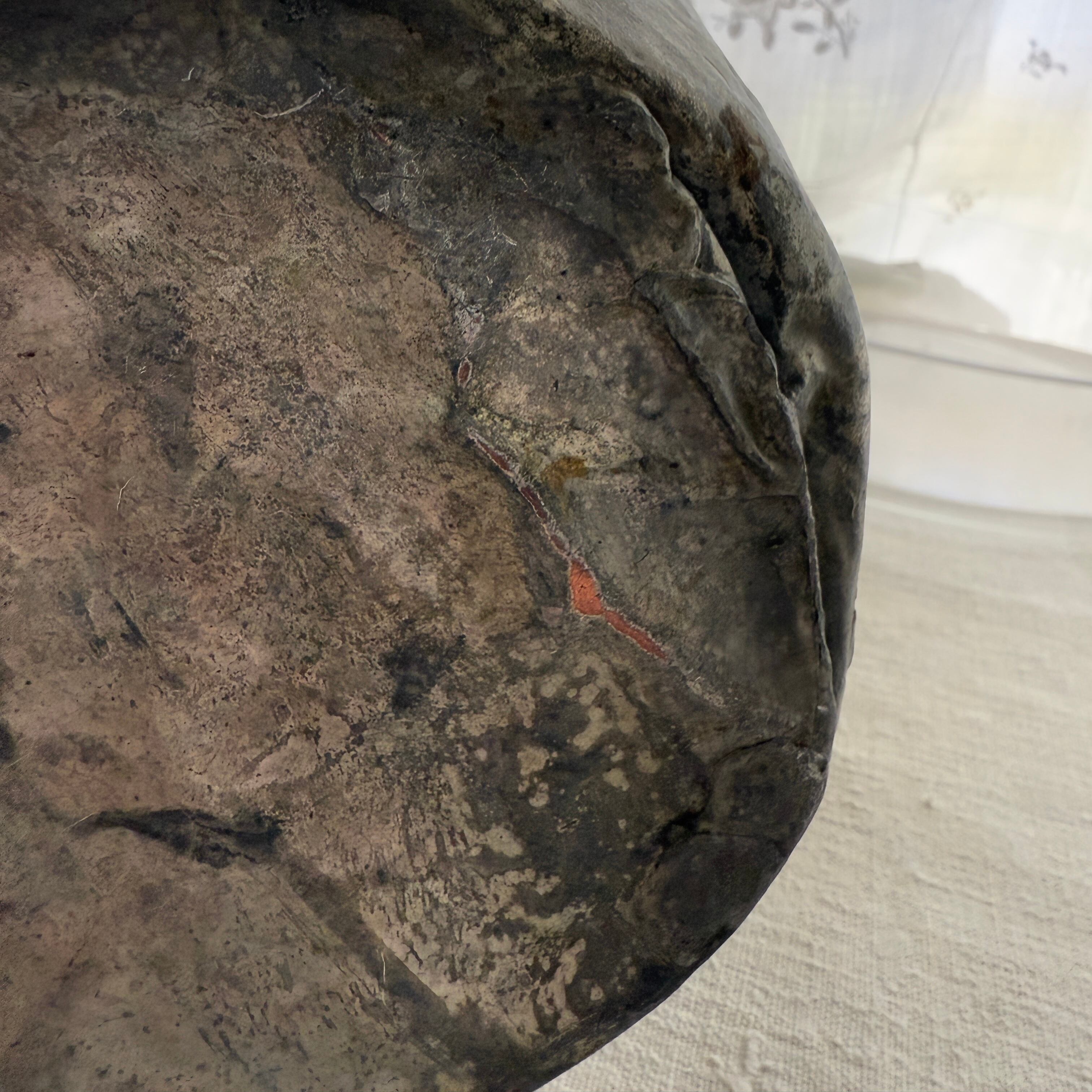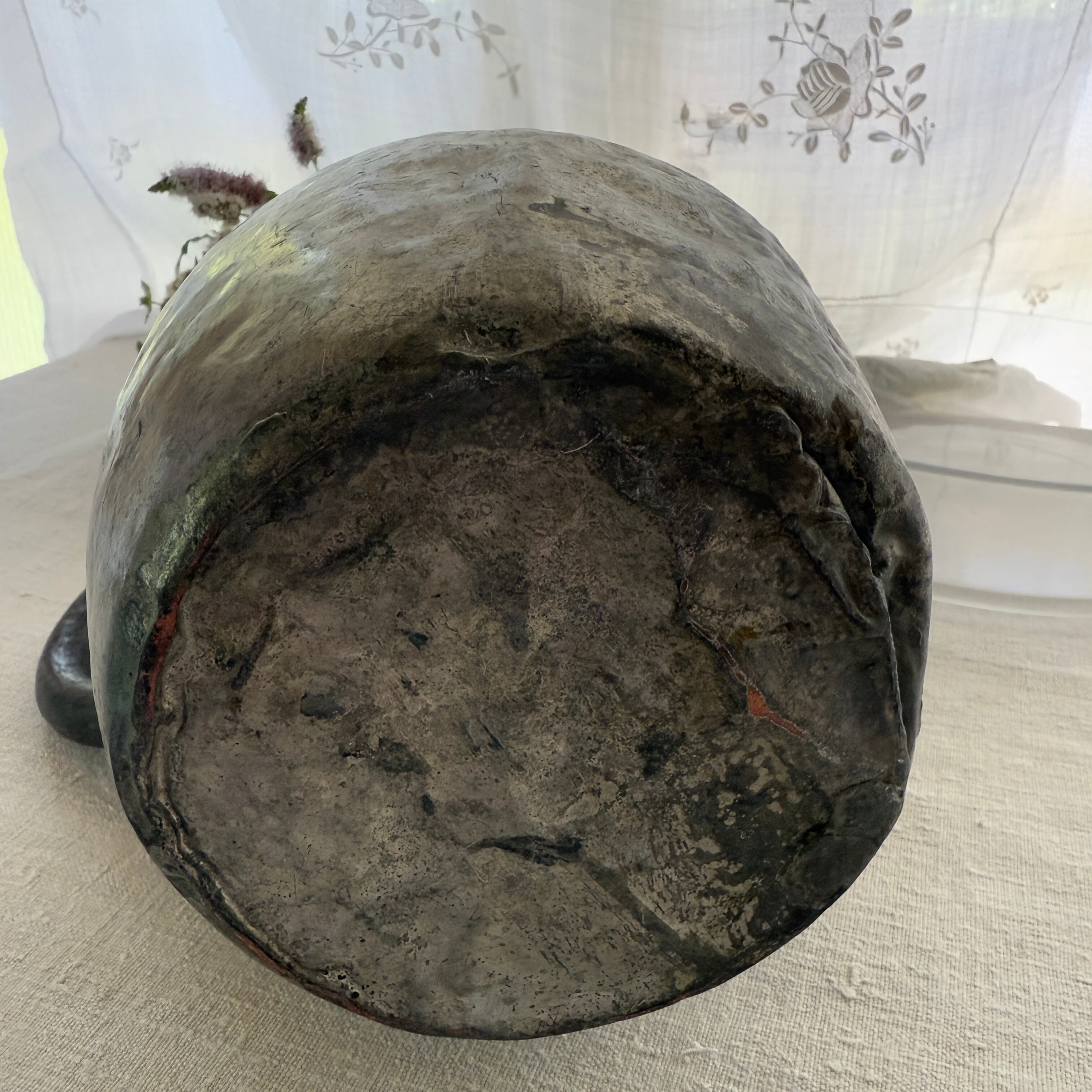 The curved body still shows the hand-hammered marks from when it was shaped by hand, giving it a warm, handmade character.