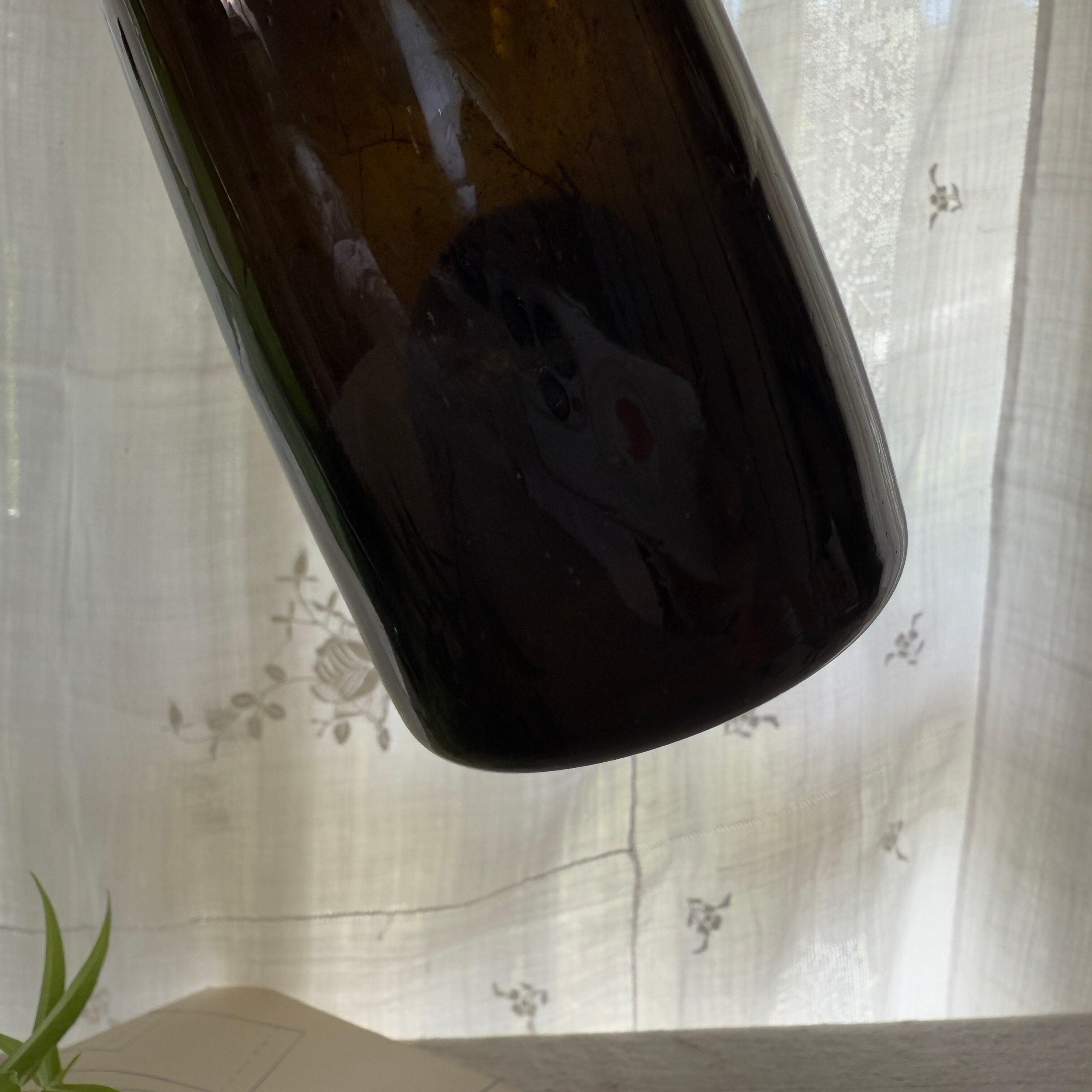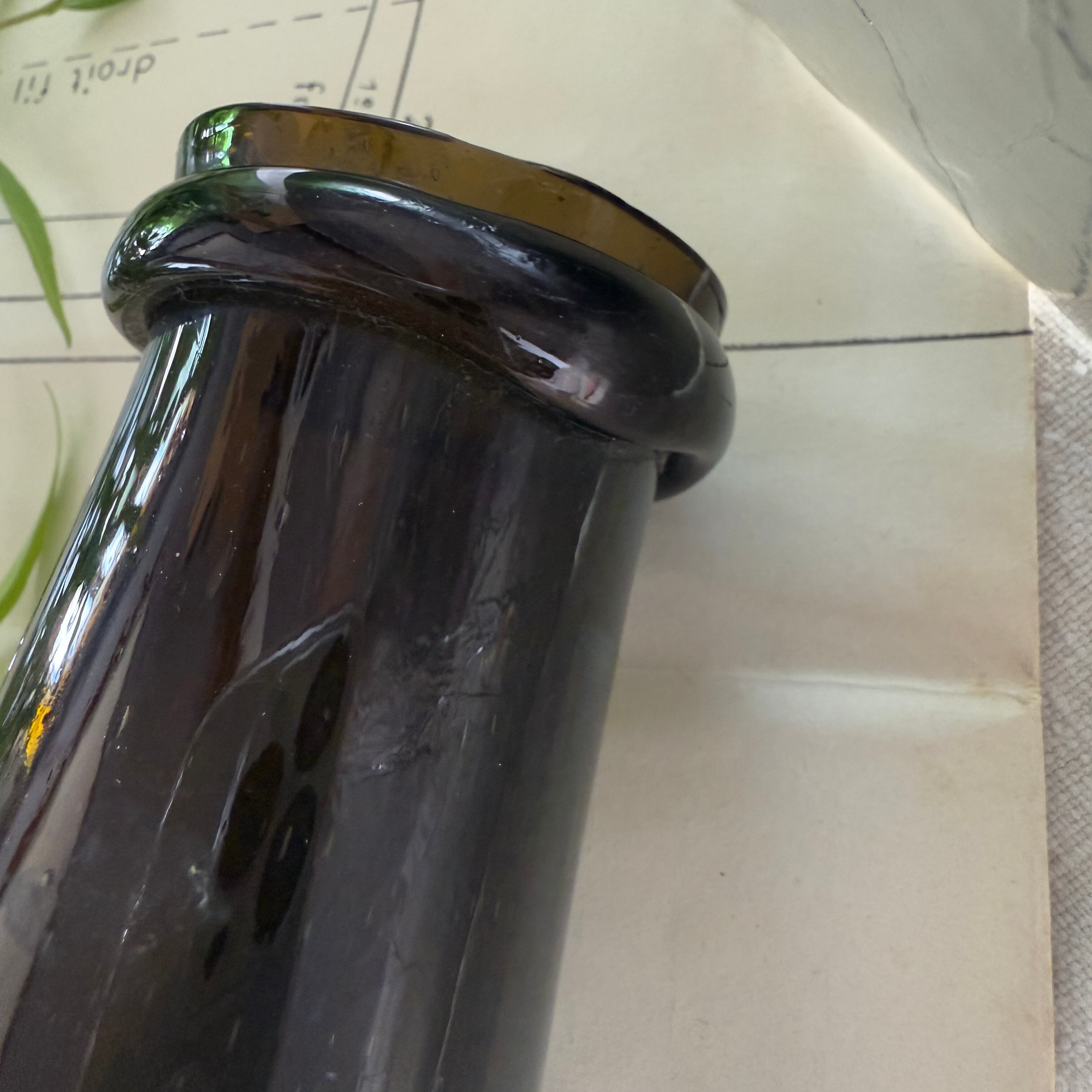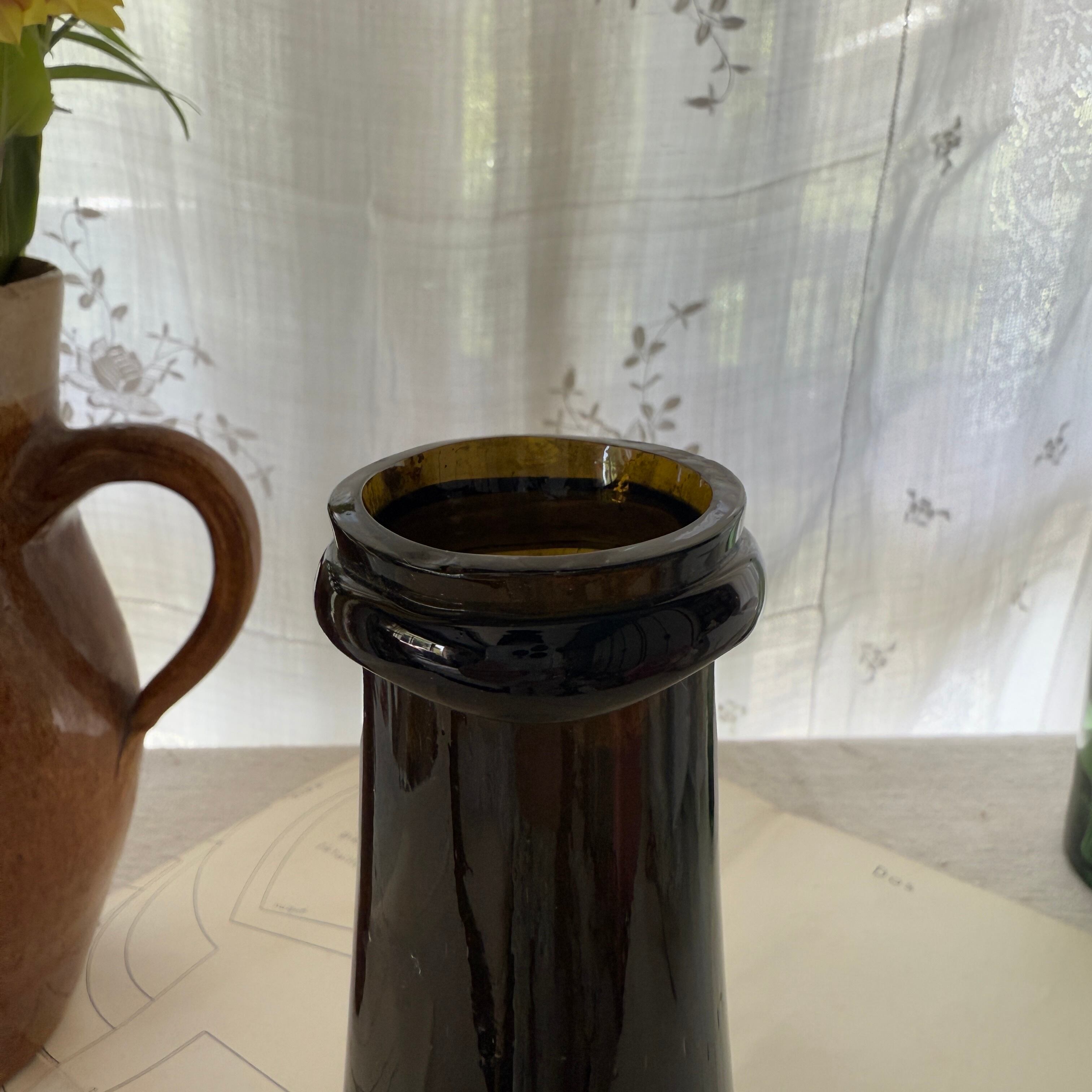 The deep dark-green glass blocks light, while the slightly narrowed neck helps create a tight seal—details that clearly reflect its original purpose as a storage bottle.
