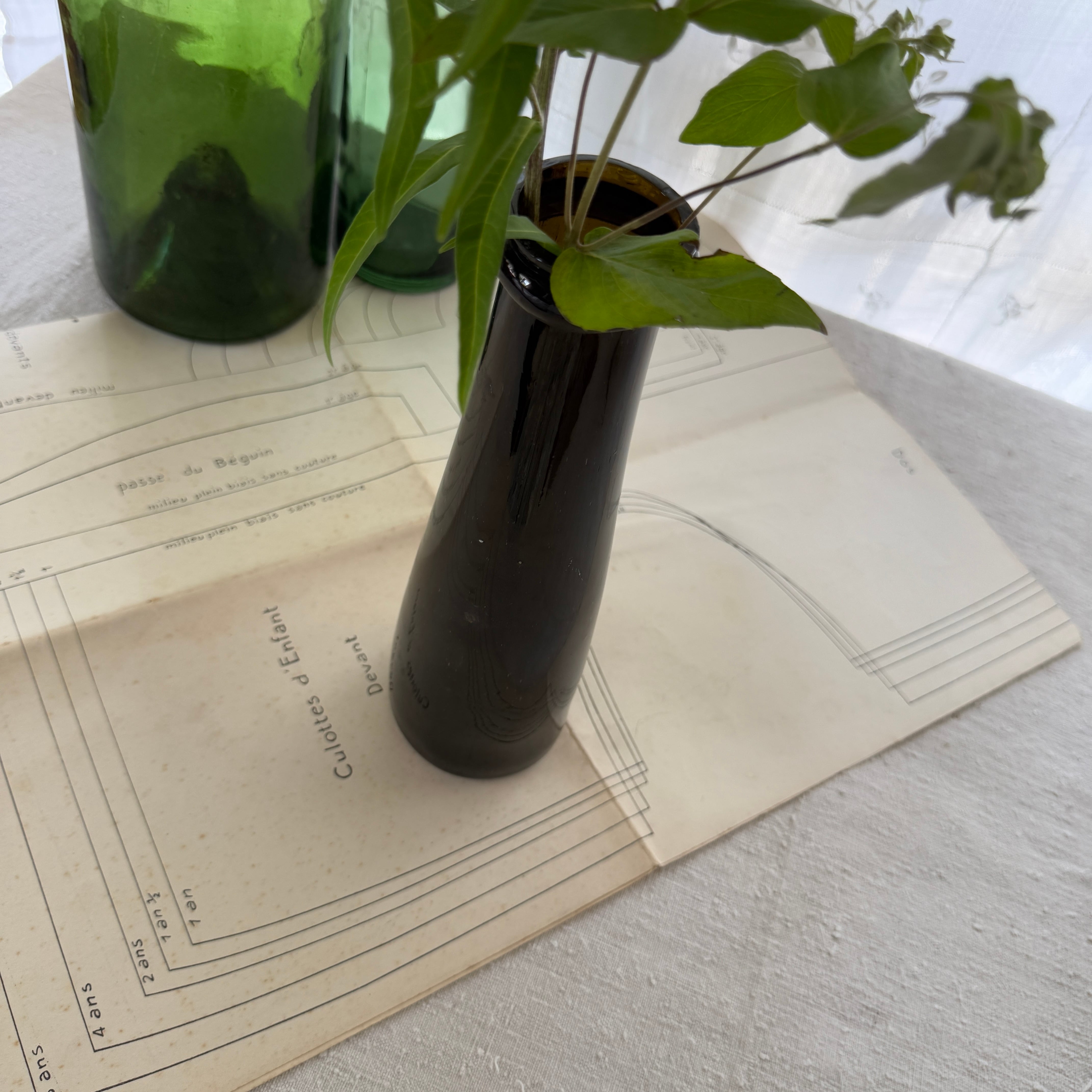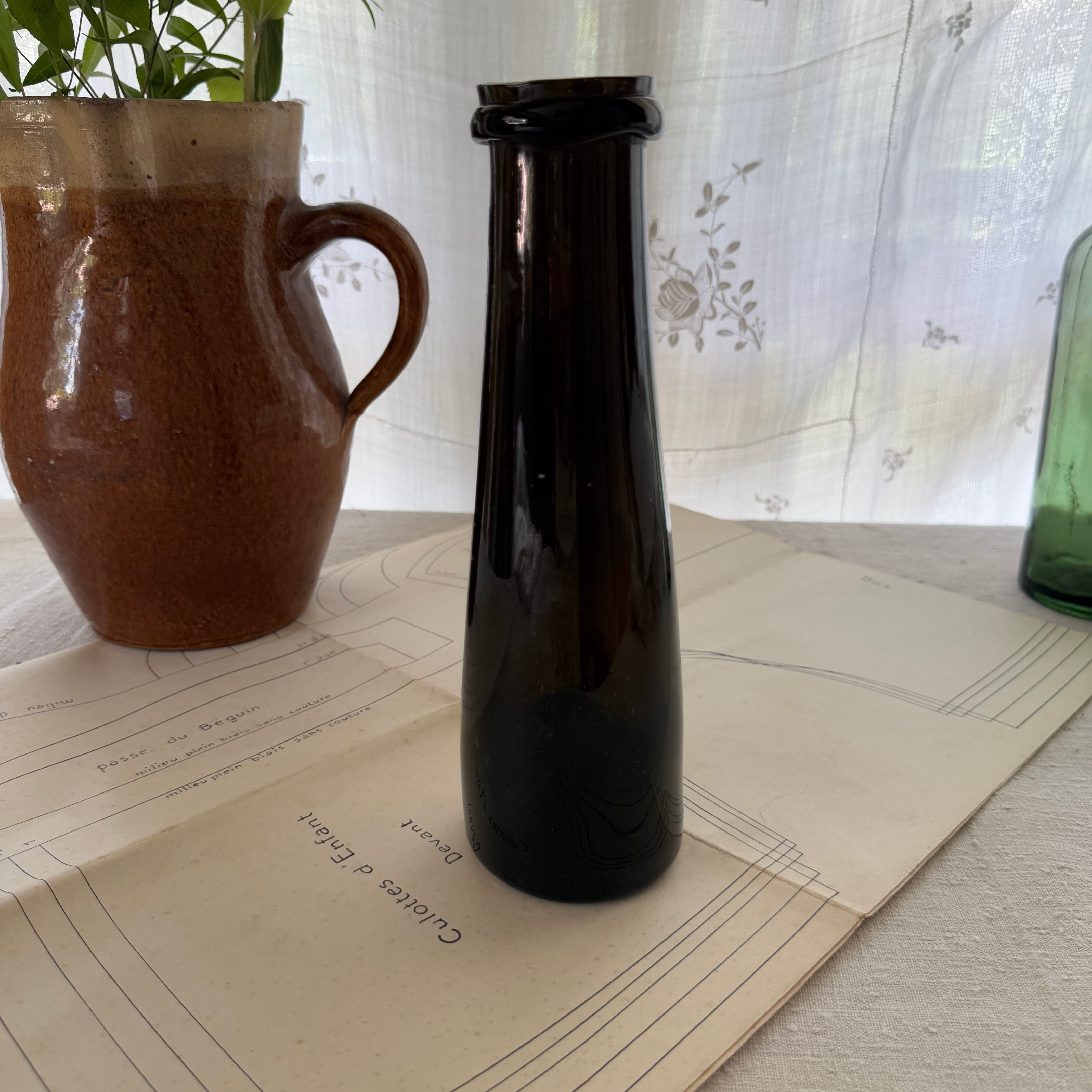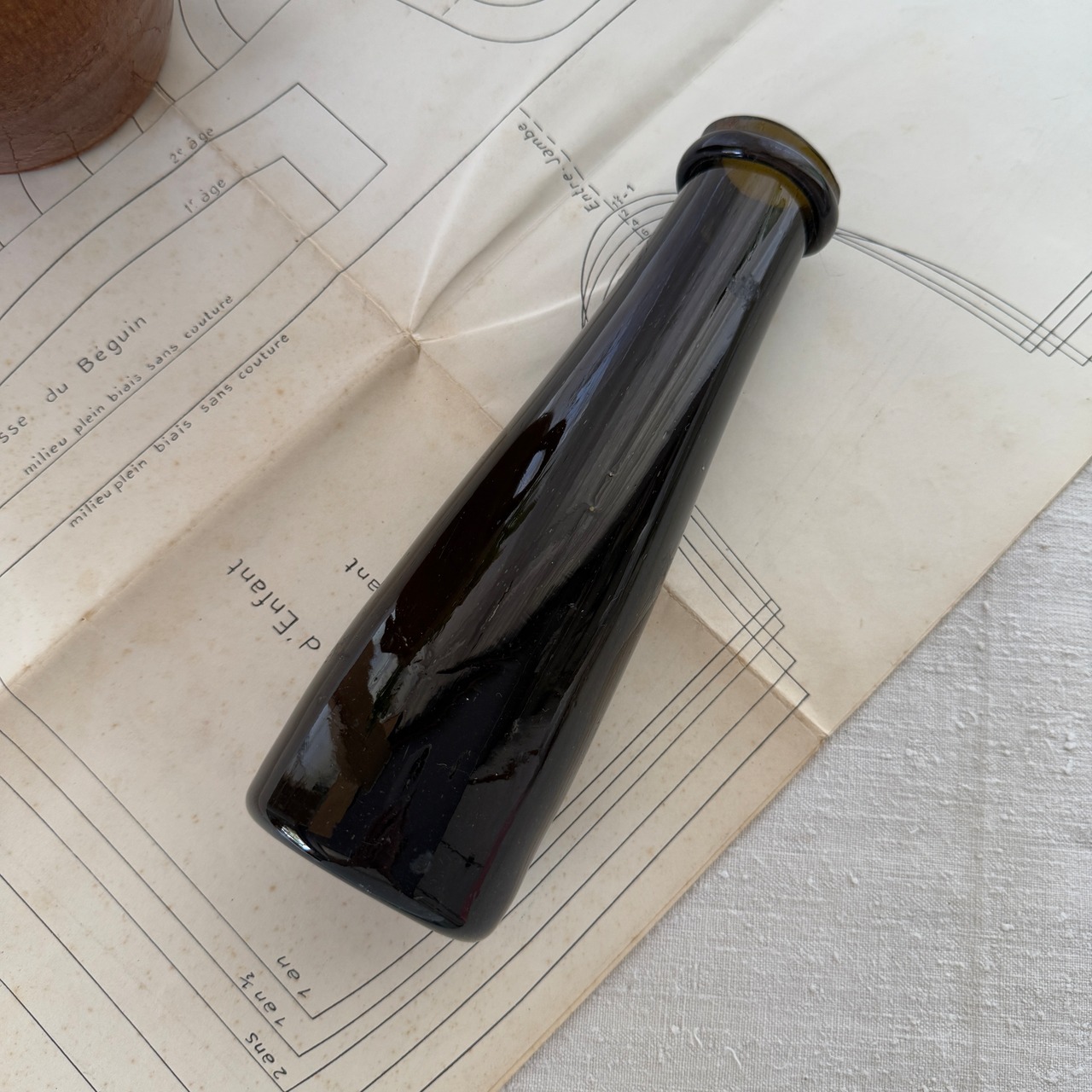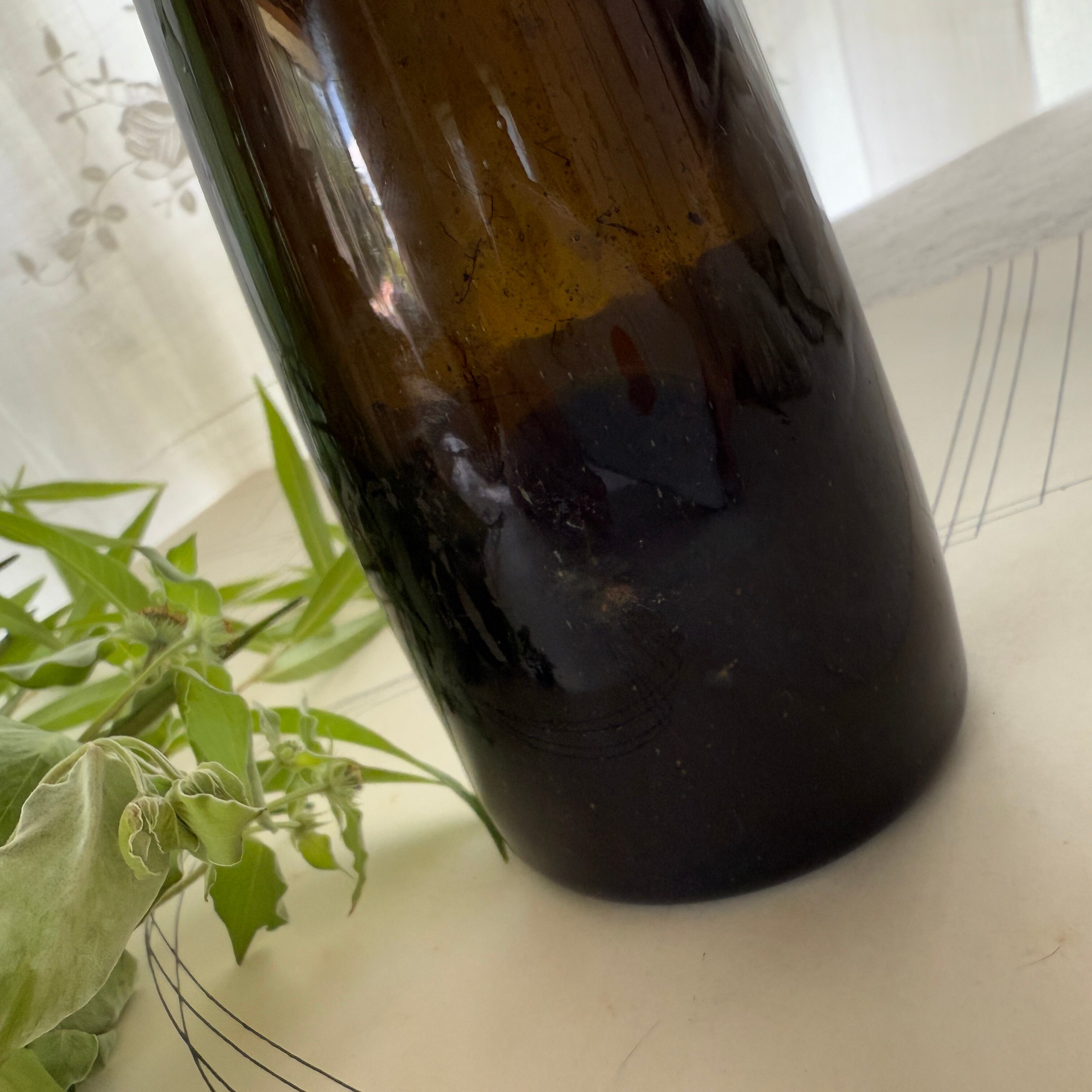 The deep dark-green glass blocks light, while the slightly narrowed neck helps create a tight seal—details that clearly reflect its original purpose as a storage bottle.